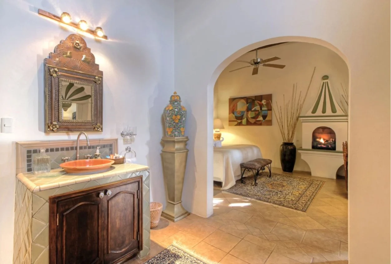 Discover this chic and conveniently situated room adorned with numerous accents by Dotty Vidargas, ideally positioned on the main level of the hacienda, making it a perfect choice for those seeking easy accessibility with "no steps" involved. You'll find the bedding options of a King-sized bed or (2) Twin-beds, accompanied by an exquisite colonial Mexican decor. This room boasts an array of superior amenities, including a fireplace, wood-beamed ceilings, captivating John Beadle artwork and paintings, and a recently renovated bathroom complete with a separate stand-alone tub and a luxurious walk-in rain shower. It's beautifully adorned with blue and white traditional colonial tiles from Dolores Hidalgo, complementing the toilet and sink.