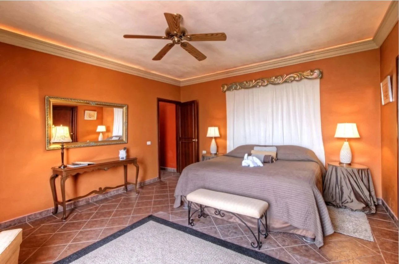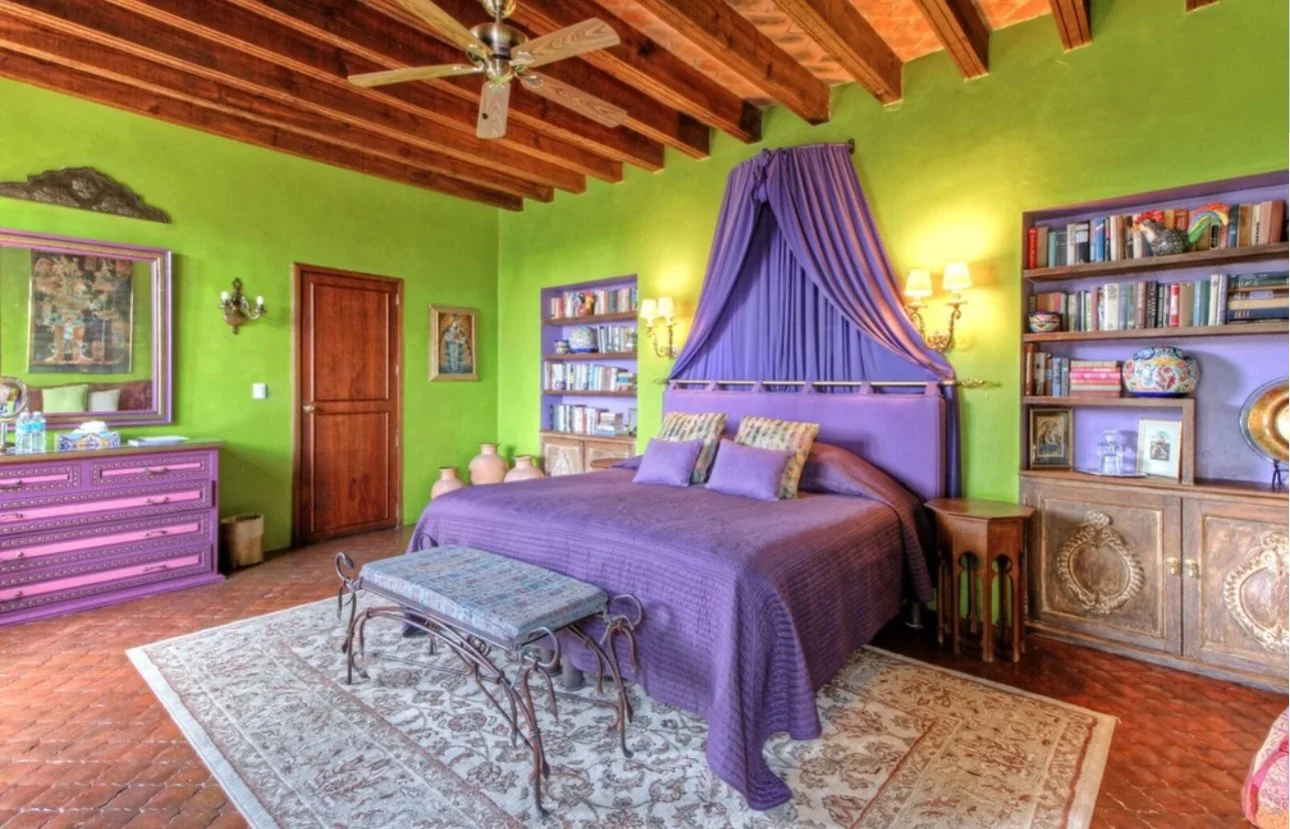 A colorful high ceilinged guest room with a gas fireplace. French doors open to the gardens and outdoor sitting areas and pool. A Turkish corner is the perfect spot to relax, nap, or read. The bookshelves are stocked with the collection of the original Casa owners, and has been added to over the years by guests who finish novels on vacation.