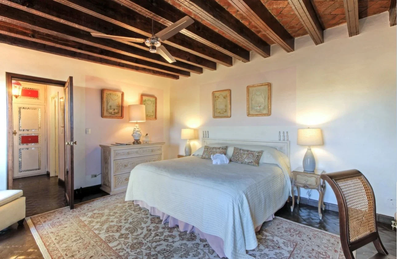 This exquisite King-sized bedroom suite boasts high ceilings, a spacious bathroom, a gas fireplace, and a private balcony sun deck offering breathtaking views of downtown San Miguel and the inviting swimming pool below. When you open the French doors, you're greeted by the enchanting sight of the Parrochia, the gothic church at the heart of the town. The covered sun deck is an ideal spot for post-dinner gatherings, as well as leisurely reading and relaxation. The bathroom has been recently renovated and features a standalone bathtub and a convenient walk-in rain shower. It is elegantly adorned with traditional blue and white colonial tiles from Dolores Hidalgo, complete with a toilet and sink. Please note that this suite is located on the second level and access is via a staircase.