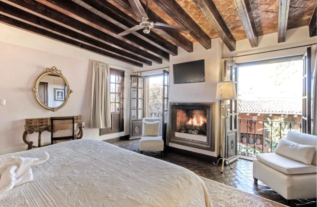 Nestled on the highest floor, this exceptionally private room, boasting captivating vistas of the Guanajuato mountains, exudes an irresistibly romantic atmosphere. Welcome to "El Cielo," an exclusive retreat featuring a luxurious King-sized bed. Its opulent colonial Mexican decor invites serenity, complemented by the gentle sounds of the nearby fountain and pool, audible through its graceful French beveled glass doors. Adorned with rich fabrics, antique furnishings, and a cozy fireplace, it exudes an abundance of charm. Not to mention, the awe-inspiring view of downtown and the Parroquia church is simply breathtaking.
